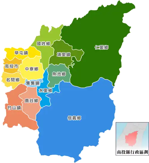 Nantou County consists of 1 city, 4 urban townships, 6 rural townships, 2 mountain indigenous townships, 128 villages and 133 neighborhoods.[6][7][8] Nantou City is the seat of the county which houses the Nantou County Government and Nantou County Council. The incumbent Magistrate of Nantou County is Lin Ming-chen of the Kuomintang.