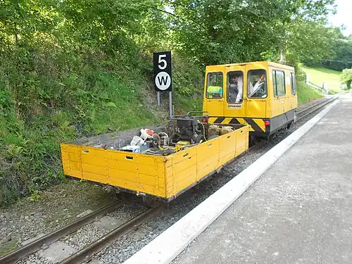 The Permaquip locomotive and wagon form a works train at Nantyronen railway station.
