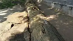 The petrified tree trunk is believed to be over 120 million years old, and is considered to be evidence for the presence of a sea during the Cretaceous period in this area. This fossil is of a conifer, measures around 18 meters long and a geological treasure.[1] Similar fossilized tree trunks have been found in nearby Varagur, Anaipadi, Alundalippur, and Saradamangalam,[5] all located within 10 kilometres (6.2 mi) of Sathanur.
