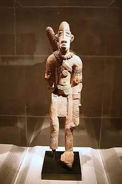The museum hosted 130 special exhibitions in its first 25 years,[4] and since joining the Smithsonian, hosts two to three temporary exhibitions annually.[31] In its pre-Smithsonian years, the museum's exhibitions were often loaned, such as from the Renee and Chaim Gross Foundation. In the early '80s, its curators organized "focus" exhibitions centered around a single object from the collection. The museum hosted outside curators and traveling exhibitions. Its shows became more ambitious as its museum relations and budget grew.[5] At the opening of the National Mall building, the museum showed 375 works in five small- and mid-sized exhibits with survey and single-theme scopes. The central exhibit, "African Art in the Cycle of Life", exhibited 88 items in seven sections following seven phases of African tribal life to provide social context for their use. For example, sections such as "Continuity" displayed hand-carved maternity figures, "Transition" displayed coming-of-age ceremonial masks, and "Towards a Secure World" displayed priest and healer items. Many of the pieces were masterpieces borrowed from American and European museums and private collections. Another exhibit showed 100 items from the museum's collection. The remaining three exhibits were smaller: West African textiles, Benin sculptures, and copper reliefs, and useful objects like baskets, hairpins, and snuff boxes.[27] The exhibitions were chosen to confront stereotypes of African art as overly "expressive, ritualistic, and ... undocumented", and instead show perspectives overlooked in Western views on African art.[6]