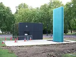 The memorial was built to a design by Lord Foster of Thames Bank and Danish designer Per Arnoldi, on the corner of The Mall and Horse Guards Road, directly outside the Old Admiralty Building.[6] The site was occupied at the time by an air shaft on the Bakerloo line of the London Underground.[4]