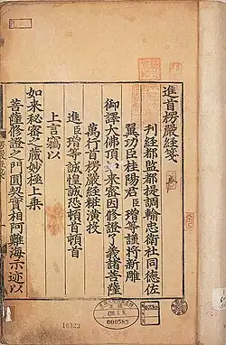 - ^ "초조본 대방광불화엄경 주본 권1" [Avatamsaka Sutra The Flower Garland Sutra, Zhou Version, the First Tripitaka Koreana Edition, Volume 1]. Korea Heritage Service (in Korean). Retrieved February 5, 2024.