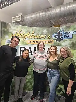 On 5 February 2025, Elmaloglou featured in a Radio Times interview about the tour.[13] Valentine appeared on the 11 February edition of the Channel 5 talk show, Jeremy Vine to promote the tour.[27] On 6 February, Valentine appeared on BBC Radio Scotland's "The Afternoon Show" to promote the tour's Glasgow show and the 'Neighbours anniversary. She discussed the tour and her experiences from the first show in Birmingham. Valentine told Michelle McManus that the atmosphere at the there was "mad" and "overwhelming". She added "it was insane, I felt like a Beatle."[28] On 13 February, Elmaloglou, Cowden and Paris appeared on ITV morning This Morning. They discussed their experience of appearing on stage at the London Palladium on the previous evening.[15] Also that day, Cowden and Davis appeared on BBC Radio Wales to promote the tour and were interviewed by Behnaz Akhgar. They were mainly promoting the Cardiff show, held at the Wales Millennium Centre. Cowden revealed that a previous Neighbours cast member works at the Wales Millenium Centre and could possibly make an appearance.[14]