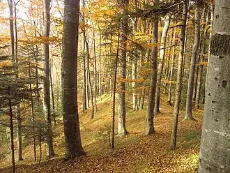 Tree and shrub species include: English oak (Quercus robur), Common hornbeam (Carpinus betulus), European beech (Fagus sylvatica), European ash (Fraxinus excelsior), Turkey oak (Quercus cerris), Sessile oak (Quercus petraea), Black alder (Alnus glutinosa), European yew (Taxus baccata), Manna ash (Fraxinus ornus), Turkish hazel (Corylus colurna), European cornel (Cornus mas), Eurasian smoketree (Cotynus coggygria), Ruscus (species of: Ruscus aculeatus or Ruscus hypogllosum), and Lilac (Syringa vulgaris).[6]