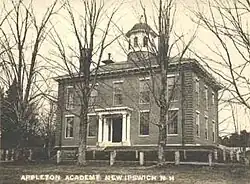 New Ipswich was granted in 1735 to 60 inhabitants of Ipswich, Massachusetts, whence the name is derived, by colonial Governor Jonathan Belcher and the General Court (Assembly) of Massachusetts. Settlement began in 1738, when Abijah Foster arrived with his wife and infant daughter. In 1762, Governor Benning Wentworth incorporated the town as "Ipswich", and then in 1766 as "New Ipswich". New Ipswich Academy, later renamed Appleton Academy after benefactor Samuel Appleton, was chartered in 1789,[3] the second oldest in New Hampshire after Phillips Exeter Academy in Exeter. It would also serve as high school for the nearby communities of Mason and Greenville.