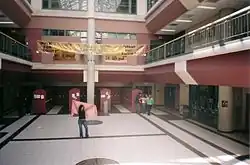 The atrium of the current N.H.S. Student groups often make banners that are attached to the railings of either hallways, as shown in the image.