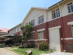 Newmarket State School's new brick school building (now called Block A) was opened on 30 June 1934 by the Minister for Public Instruction (Frank Cooper).[50] It was a two-storey masonry building, constructed from red brick with a darker brick base and pale stucco treatment to the upper floor. It had a hipped roof with gables over the entrances and a prominent ventilation fleche. The main entrance was through a portico with three round arches. Gables featured a half-timbered ornamental effect, utilising timber, fibre-cement panels and terracotta tiles. The building contained 13 classrooms, a head teacher's office, and retiring rooms on both floors. Circulation was provided by an internal staircase at the eastern end and an external timber staircase attached to the western wall. Windows on the southern elevation were protected by terra-cotta tile-clad window hoods. Landscaping in front of the new building including a row of fig trees along the Banks Street fence line (two of which survive), and the laying out of pathways.[51][49][1]