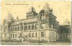 Nikolai Pinegin studied at the provincial real school for some time. Then the family moved to Perm, and the boy was sent to the local gymnasium. Nikolai studied badly, and his character made itself known: he was expelled from the fifth grade "for disobedience" (refusal to attend church services). Finally, in 1900, Nikolai left his family for good and began an independent life. To get to Kazan, he earned money by painting portraits, played in a brass band (he was generally characterized by musicality and had great abilities), joined a traveling troupe. In 1901, he was admitted to the Kazan Art School as a free student without examinations. Pinegin's petition of February 27, 1902 for admission to the ranks of active students of the IV class and exemption from examinations in arithmetic and geography due to the existence of a certificate of completion of four classes of the gymnasium has been preserved. The petition was granted, and from the same document it is known that in terms of social stratification he was "the son of a civil servant", and his father lived at that time in Nozhyovka, Perm Governorate. Pinegin was also mentioned in the "General Alphabetical List" of the Art School for the academic year 1904–1905; at that time he lived in the house of Petrova at 1st Soldatskaya Street.[3][4][5]