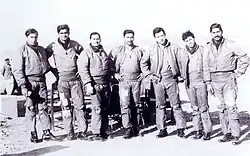 Fighter pilots of the No. 26 Squadron during the 1971 war. From left-to-right, Pervez Mirza, Flt Lt Salim Baig Mirza, unknown, Flt Lt Amjad Enderabi, Flt Lt Rahim Yousufzai, Shafqat and Flt Lt H K Dotani.