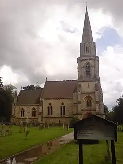 Within the village there is a Church of England Church, *All Saints.[72] All Saints Anglican parish church is Grade II* listed.[73] It was built in 1862 by George Gilbert Scott, and according to Pevsner is a "typical estate church" and "one of Scott's major works". It is of Early English style in Ancaster stone, with a 130 feet (40 m) steeple. On the walls are drawn religious scenes outlined in red. There are stained glass windows by Clayton and Bell. Monuments are to Sir William Ellys (died 1680), attributed to William Stanton, to the Fourth Earl of Buckinghamshire (died 1816), to Rev. Henry Hobart, Dean of Windsor (died 1846), and to the First Earl of Ripon (died 1859), this designed by George Gilbert Scott with an 1862 effigy by Matthew Noble.[74] All Saints was built on the site of a previous St Peter's church built by the Third Earl of Buckinghamshire in 1775, who destroyed an original St Peter's Church because it was "too near the Hall". The monument to Sir William Ellys is from the original church.[75] Cox describes the 1775 church as having been "a mean affair".[75][76]