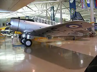 The remaining 119 undelivered aircraft were bought up by the British Purchasing Commission and transferred to the Royal Canadian Air Force (RCAF) for the British Commonwealth Air Training Plan between August and September 1940,[2] and all were operational by November[5] The type was named the Yale Mk.I[note 1] following British naming practice of naming trainers after education institutions and US-supplied aircraft after American locations, in this case, Yale University, and were used initially as intermediate pilot trainers taking pilots from the de Havilland Tiger Moth and Fleet Finch to the much faster and more complex North American Harvard,[4] until this category was dispensed with as being unnecessary. They were then relegated for use as airborne wireless radio trainers, along with the contemporary Fleet Fort intermediate trainer in 1943.[6][7] Prior to service entry, the throttle and engine mixture controls were modified from the system used by the French whereby the throttle was pulled back to increase power, and the mixture control pulled back to lean out the mixture, to the system used on the Harvard.[5] The Yale appeared in the movie Captains of the Clouds. The RCAF sold all surviving examples off as scrap in 1946 but over 30 survive today as a result of a large number of them being bought surplus by a single farmer, with about 15 currently in airworthy condition.