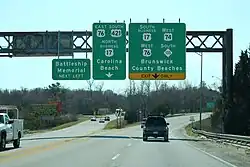 In 2014, construction began on the 2.2-mile-long (3.5 km) Long Beach Road Extension in Brunswick County which removed NC 133 from a concurrency with NC 211 and shortened its concurrency with NC 87.[25] The project was completed on January 10, 2016.[26] In 2016, construction on a diverging diamond interchange was completed at the US 17/US 74/US 76 interchange in Leland.[27]