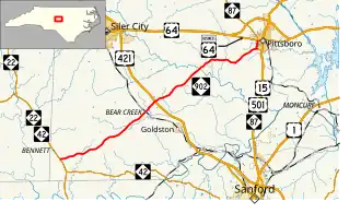 Between 1958-63, NC 902 was truncated, just south of Bennett, at NC 22/NC 42; the old alignment became part of NC 42.[6][7] In 1964, NC 902 was extended east to its current eastern terminus at US 64 (now US 64 Bus.) and NC 87 in Pittsboro.[8][9] In 2000, NC 87 was rerouted onto 0.8 miles (1.3 km) of NC 902 in Pittsboro.[10][11]