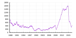 The North Dakota oil boom was the period of rapidly expanding oil extraction from the Bakken Formation in the state of North Dakota that lasted from the discovery of the Parshall Oil Field in 2006, and peaked in 2012,[1][2] With slightly less than 100,000 barrels of oil being produced per day in 2007 to about 1,000,000 barrels produced per day in 2014. By 2015, there was substantially less growth noted due to a global decline in oil prices.[3][4] The Boom was led by companies such as Continental Resources, Whiting Petroleum, Hess, ExxonMobil and EOG Resources.[4]