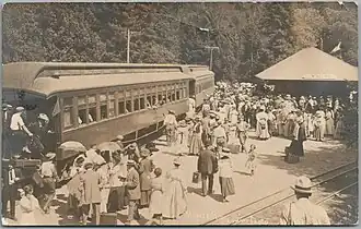 The NSR was operated by John Martin and Eugene de Sabla Jr., pioneers in the electric railroad business. The southern 23 miles (37 km) of line were modernized to allow operation of standard-gauge electric passenger cars in addition to narrow-gauge steam-powered freight trains. Electric cars sometimes shared dual-gauge tracks with the steam trains, while at other locations a separate track for the electric cars was constructed parallel to the narrow-gauge route. The line was ultimately double tracked from Sausalito to San Anselmo except for the Alto tunnel. A power house was built at Alto and power was also purchased at San Rafael. Direct current electrical power was transmitted to the trains at 600 volts by a third rail (which was actually a fourth rail on the dual-gauge segments.)[5] Service started to Mill Valley on August 20, 1903, and to San Rafael on October 17, 1903. It was the first United States steam railroad electrified for operational efficiency rather than for smoke abatement. The railroad established practices later used in Grand Central Terminal and the interborough subways of New York City.[6] The electric lines were expanded after 1907 as part of the Northwestern Pacific Railroad. Interurban services ceased on February 28, 1941.[7]