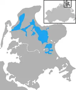 The North Rügen Bodden (German: Nordrügener Bodden or Rügenschen Innenboddenkette) are a string of West Pomeranian lagoons, known as bodden, on the Baltic Sea coast of northeastern Germany. They are almost entirely surrounded by the island of Rügen and its peninsulas. For example, in the north they are bounded by the Bug, the peninsulas of Wittow and Jasmund and the spit of Schaabe. To the south is the Muttland, the main body of Rügen Island. Amongst the highest points in the surrounding ridges of terminal moraine are the Rugard (118 m above NN) near Bergen, the Tempelberg (50 m) near Bobbin, the Hoch Hilgor (43 m) near Neuenkirchen, the Banzelvitz Hills (45 m) near Rappin and the Mühlenberg (25 m) between Buschvitz and Stedar.
