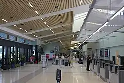 The new airport has a much larger terminal, designed by HNTB,[14] compared to the terminal at the previous airport. The terminal, 105,000 sq. feet, has seven gates. Gates 1–5 have jet bridges, while Gates 6 and 7 are on ramp level for regional aircraft. The airport has a US Customs and Border Protection inspection facility for arriving international flights. No international Airline flight has ever departed or arrived at KECP. It was anticipated that the new terminal building will be the first airport terminal to attain a LEED rating for being a green building as well. As of June 2024, it has yet to receive this. A new terminal building at Appleton International Airport has since become the first LEED-rated terminal building in the world.