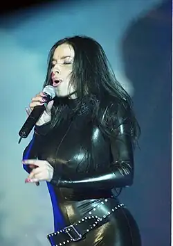VIA Gra (from left to right: Vera Brezhneva, Albina Dzhanabayeva and Nadezhda Granovskaya) performing in Moscow, 2005. This line-up was often referred to as the "diamond line-up" in mass media, because of the song "Бриллианты" ("Diamonds"), released at that time, which became a huge hit and was their signature song.[9][10][11]