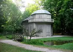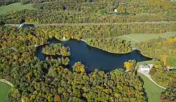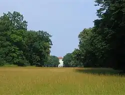 The largest area of the park is occupied by the English-style landscape garden. The northern part is defined by panoramic vistas of the Pagodenburg Lake with the Pagodenburg and the Pagodenburg valley, A meadow valley is running to the north with a brook, that flows into the Kugelweiher pond. The southern part is even more diverse with a panoramic vista of the large Badenburg Lake, It allows visitors views of the water surface at the Apollo temple (built in the form of a monopteros) and the Badenburg, behind which a wide meadow valley, called the Löwental (Lion Valley) leads to the south, as well as to a hamlet, the Amalienburg and the Crown Prince Garden south of the Great Parterre.[9][28]