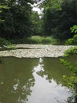 The park's lakes are emptied once a year, which prevents vegetation from forming in the water, and are almost entirely enclosed by artificial banks. An exception is the Kugelweiher pond, a natural water with natural banks, flanked by a 0.5 to 2.0 m (1.6 to 6.6 ft) wide skirt of lesser pond-sedge. There also are found the common skullcap and gypsywort as well as water lilies on the pond surface. The northern section of the inlet to the pond is lined with sedges and tall bushes. Numerous water birds such as the mute swan, geese and ducks as well as the carp in the lakes benefit from intensive feeding by park visitors. However, the high nutrient input affects the water quality.