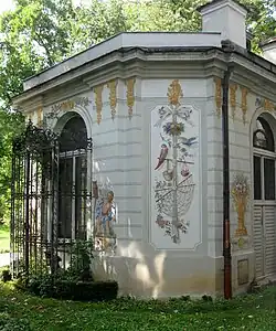 The Small Cascade is surrounded by four Konrad Eberhard still images. They depict Leda with the swan (1810), Silen (a satyr) with Bacchus as a boy (1812), the sleeping Endymion (1820) and Diana hurrying towards him (1820). The sculptures on display are copies, whose originals had been made from Carrara marble. The octagonal bird house, created by François de Cuvilliés in 1757 is placed in the northern part of the garden. The building - a small garden pavilion - is executed in stone and plastered on all sides. A protruding, cage-like grating, made of wrought iron is fixed to the front of the southern window. The building is also a Cuvilliés creation. The vivid paintings are the work of Ambrosius Hörmannstorfer (restored in 1977 by Res Koller).