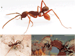 Army ant Eciton mexicanum workers with N. kronaueri attached between the ants’ petiole and postpetiole.