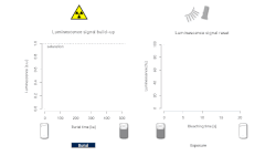 Typical OSL curve signal build-up (left) through ionising radiation and depletion (right) through light exposure.