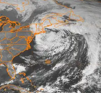 Before affecting Canada with high winds and waves, the storm system produced heavy early-season snowfall totals in New England and southeastern Canada.[1] In Baxter State Park in northern Maine, snowfall totals reached 24 in (610 mm). The combination of snow and wind gusts of 40 mph (64 km/h) broke tree limbs and caused power outages.[3] Further south, winds of 55 mph (89 km/h) struck eastern Massachusetts, which downed several power poles; about 1,200 people lost power.[5]