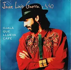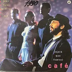 "Ojalá Que Llueva Café" (English "Hope That It Rains Coffee") is the lead single by the Dominican artist Juan Luis Guerra and his band 4:40 from their fourth studio album of the same title. It was released on 1989 by Karen Records and 1990 in Europe by Ariola Records. The lyrics are a poetic metaphor about the poor conditions of the hard-working people residing in the countryside and the hope that the things are going be better someday in the future.[1] It is one of Guerra's signature songs and one of the first tracks to gain international attention in his career, peaking on the Billboard Hot Latin Tracks and Latin America airplay charts. The music video was ranked number one of the top 15 best music videos of all time by Dominican artists.[2]