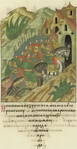 Oleg Svyatoslavich with the captive Mstislav III of Kiev,miniature from the Illustrated Chronicle of Ivan the Terrible (16th century)
