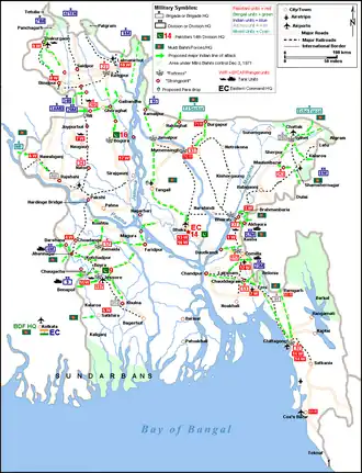 Final Indian Army operational plan in November 1971. A generic representation; some unit locations are not shown. Indian IV Corps operation may have been known as "Operation Jackpot".