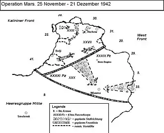 Operation Mars (Russian: Операция «Марс»), also known as the Second Rzhev-Sychevka Offensive Operation (Russian: Вторая Ржевско-Сычёвская наступательная операция), was the codename for an offensive launched by Soviet forces against German forces during World War II. It took place between 25 November and 20 December 1942 around the Rzhev salient in the vicinity of Moscow.