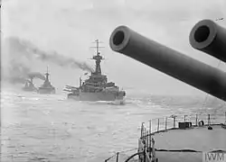 The Grand Fleet sortied on 18 August 1916 to ambush the High Seas Fleet while it advanced into the southern North Sea, but a series of miscommunications and mistakes prevented Jellicoe from intercepting the German fleet before it returned to port. Two light cruisers were sunk by German U-boats during the operation, prompting Jellicoe to decide to not risk the major units of the fleet south of 55° 30' North due to the prevalence of German submarines and mines. The Admiralty concurred and stipulated that the Grand Fleet would not sortie unless the German fleet was attempting an invasion of Britain or there was a strong possibility it could be forced into an engagement under suitable conditions.[32] Along with the rest of the Grand Fleet, they sortied on the afternoon of 23 April 1918 after radio transmissions revealed that the High Seas Fleet was at sea after a failed attempt to intercept the regular British convoy to Norway. The Germans were too far ahead of the British to be caught, and no shots were fired.[33] The sisters were present at Rosyth, Scotland, when the German fleet surrendered there on 21 November.[34]