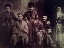 I. Ivanov, in his article "Chechnya" published in the Moskvityanin magazine, wrote that Chechnya borders on the west with the Ingush tribes Tsori, Galgai, Galash and Karabulak.[32] The Czech-German biologist and botanist Friedrich Kolenati in his work about the Caucasians, wrote about the Orstkhoy as an Ingush tribe alongside Galashians, Kists and others.[33] Adolf Berge in his work "Chechnya and Chechens" gave the following nomenclature of the Ingush: Nazranians, Karabulaks, Galashians, Dzherakh, Kists[note 9] Galgai, Tsorins and Akkins.[34][35][36][37] V. A. Volkonsky stated that the Ingush people consist of societies to which he added Orstkhoy and one of the subgroups of Orstkhoy – Merzhoy.[38] A. Rzhevusky in his work "Tertsy" wrote about Karabulaks and Galashians as the restless and militant Ingush societies.[39] According to V. Chudinov, the Karabulaks, Galashians and Alkhons are Ingush who belong to the Arshtkhoy tribe.[40] According to Vasily Potto, Nazranians and Orstkhoy are Ingush societies who once formed one rather a significant and powerful tribe.[41] Russian Count and Minister of War Dmitry Milyutin wrote in his memorials that the Orstkhoy are Ingush who made up part of the Ingush population of the Vladikavkazsky okrug.[42]
