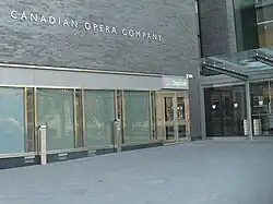 Entrances to the station were all built as open stairways from the sidewalk, with the panel above the lintel emblazoned with the scales of justice, which referenced the Superior Court of Justice at Osgoode Hall. Subsequent refurbishment resulted in a generic TTC style replacing the unique symbolism. In 2006, a new entrance, with elevator access to the concourse level, was integrated into the construction of the Four Seasons Centre, at the southeast corner of Queen and University. Along with an elevator to the platform level within the fare paid area, this made the station fully accessible as of 2007.[5] Plans from 2008 call for Diamond and Schmitt Architects, who were responsible for the opera house, to design complementary covered entrances at the other three corners of the intersection.[6]