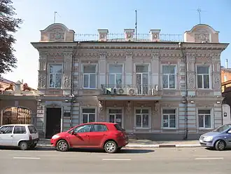 This private mansion was built in the third quarter of the nineteenth century and belonged to merchant Kiryunin. There are many stucco decorations on the facade of the building. The elements of baroque, Renaissance, classicism and Moorish architecture makes exterior of the building The arch of the gates with two sculptures of lions on its top is on the left from the central entry. There is a version that the building used to be a brothel. This theory was confirmed by H. A. Semenihin in his novel "Novocherkassk". Obviously, this is the main reason why the building has two wheel barriers on both sides of the gates - the elements of phallic art. Arriving officers used to tie their horses to them.[1]