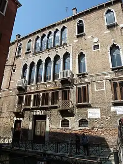 - Rear façade: Overlooking Fondamenta Corner Zaguri, it shows the remnants of a cavana (a boat entrance), indicating that the pedestrian path was a later addition. The grand quadrifora (four-light window) on the main floor is flanked by single-light windows, forming a faux hexafora. The ensemble is decorated with a checkerboard frieze and Gothic capitals.[8]