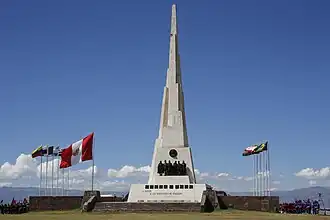 For the sesquicentennial anniversary of the battle, the Ministry of War of Peru decided to erect a monument to the combatants on the plain. Through a public competition in 1968, the proposal for an obelisk made of marble by Spanish artist Aurelio Bernandino Arias was chosen as the winner. According to the author, the work represents nearly half a century of struggle for freedom and American independence, from the Túpac Amaru II Revolution in 1780 to its victorious culmination at this location.