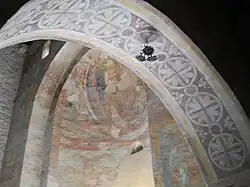 On the opposite side, in the area of the present altar, is a triumphal arch trimmed with meanders, in which figures reminiscent of an angel, the baptism of Christ, and three old men in reddish robes with a green background can be seen. Analysis of these paintings reveals a certain resemblance to the frescoes painted by Fratel Bonizzo, in 1011, at the church of Sant'Urbano alla Caffarella in Rome.[9]