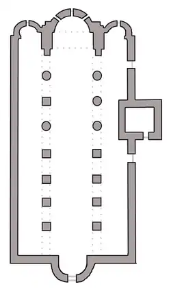 The church has a characteristic plan with the space divided into three naves, with the central one twice as wide as the side naves. The dimensions of the plan show a remarkable balance of the building; in fact, the facade of the church is about half as wide (16 meters) as the two sides (32.5 meters). The eastern side, built probably in the 11th century and in distinct Romanesque style, consists of three apses, a major one in the center and two minor ones on the sides; the central apse has three splayed single lancet windows with round arches, while the two lateral ones have only one, of similar construction, but with small arches made of tuff. The wall consists of white stone ashlars assembled with mortar and arranged horizontally. On the western side, according to some scholars belonging to the original Lombard building, there is an additional apse, where the main entrance door in Gothic style and made of red and white limestone was carved already before 1840.[19] Above the apse, at the nave, two simple single-lancet windows are inserted.