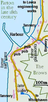 Surprisingly, a new and important industrial concern opened to the north of the village in 1800, the Lowca engineering company. In 1817, the large tannery at the south end of the village was bought for development as a colliery; the coal being mined some distance inland and brought to Parton along a tunnel called the Parton Drift, which also drained the mine workings. To convey coal to the port of Whitehaven a horse-drawn tramway was built along the foot of the cliffs.