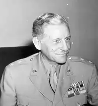 Hurley received a promotion to brigadier general (from colonel in the reserves) in 1941 when the United States entered World War II, and General George C. Marshall, the U.S. Army Chief of Staff, dispatched him to the Far East as a personal representative to examine the feasibility of relieving American troops besieged on the Bataan peninsula.[2] Dwight Eisenhower, a staff officer in Washington, sent Hurley to Australia with $10 million in cash, to arrange supplies and charters for the Philippines. According to historian Jean Edward Smith, Eisenhower had served under Hurley for the last three years at the War Department, "needed someone to organise blockade runners for MacArthur, and Hurley, an old-fashioned buccaneer in politics, with energy and decisiveness, was perfect for the job."[7] He was successful in delivering additional food and ammunition to the soldiers on three separate occasions but could not evacuate them.[2]