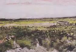 Heath with Wheelbarrow, watercolor, Autumn 1883, The Cleveland Museum of Art (F1100). Unable to find people to pose for him in Drenthe, Van Gogh paints this watercolor of the heath and represents the work of a peasant by the presence of the wheelbarrow.[35]