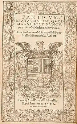6. ^ KU Leuven Libraries Special Collections, RC81 (1563). "Canticvm beatæ Mariæ qvod magnificat nvncvpatur, per octo musice modos variatum., Francisco Guerrero musices apud Hispalensem ecclesiam præfecto authore".{{cite web}}: CS1 maint: numeric names: authors list (link)