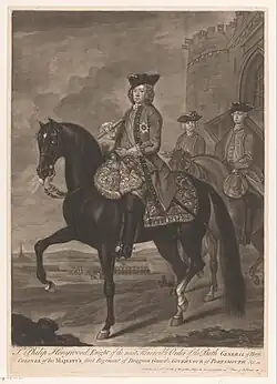 His father died when Philip was about ten. He entered the Army as an ensign in James Stanley's regiment of foot on 12 June 1694,[2] and served under King William III in the Netherlands.[3] He was promoted to captain in the Royal Fusiliers on 1 April 1696, and captain in the Earl of Huntingdon's newly raised regiment on 10 March 1702.[2] In the reign of Queen Anne he shared in the toils and dangers of two campaigns in Brabant under John Churchill, 1st Duke of Marlborough, and afterwards transferred his services to Spain. He was rewarded for his excellent conduct with the lieutenant-colonelcy of the regiment, now Wade's (and later the 33rd).[3] On 27 May 1709 he was promoted to the colonelcy of the 92nd Regiment, which was disbanded in 1712,[4][5] and in 1710 he obtained the rank of brigadier-general.[3]