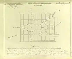 On January 16, 1784, Catherine II approved a "projected" regular rectangular building plan for the city with a longitudinal and transverse grid of streets, developed in St. Petersburg by the "commission of buildings" (the plan was signed by architect Ivan Lem).[17] The city was divided into 20 blocks. The nineteenth was called "petty—bourgeois," the seventeenth was called "noble," and the eighteenth was called "merchant."[22] Nevertheless, despite the fact that the initial master plan was a professional work, the architect was not familiar with the terrain in the vicinity of Podil, which was characterized by a large number of ravines and slopes. Therefore, at the initiative of Moscow Governor Lopukhin, adjustments were made to it: "the structure should be moved to the left by 150 fathoms, where the city is more level." The implementation of the master plan fixed a peculiar situation in the city, when the buildings of the former village of Podol remained unchanged, and new structures (primarily government buildings) were built behind the village (in fact, in the field), including offices, the Traveling Palace of Catherine II, and the national school.[17] In modern Podolsk, traces of the old layout have been preserved on the right bank of the Pakhra River, along the central planning axis of the Moscow road.[24]