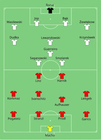 In the match against Germany, Maciej Żurawski sustained a quadriceps injury, sidelining him for the rest of the tournament. However, he stayed with the team, explaining that he was the captain of the national team.[50][51] As a result, experienced player Jacek Bąk was appointed the new captain.[52] In the second group match, played at Ernst-Happel-Stadion in Vienna, Poland faced the tournament hosts – Austria. Mariusz Lewandowski, who had twisted his ankle and bruised his shin against Germany, started from the first minute.[53] The match began with quick and decisive attacks from the Austrians. Artur Boruc performed well, preventing Poland from conceding a goal – saving a difficult shot from Andreas Ivanschitz in the 10th minute, followed by two strikes from Martin Harnik. Later, he saved a one-on-one situation against Christoph Leitgeb and stopped a shot from György Garics in the 20th minute. He flawlessly caught crosses and skillfully restarted the game, initiating counterattacks.[54]