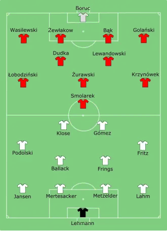 The Polish team lined up in a 4–5–1 formation. The central defenders, Dariusz Dudka and Michał Żewłakow, were supported by two defensive midfielders, Mariusz Lewandowski and Rafał Murawski. The full-backs were instructed to join the attack frequently, and Marek Saganowski was supported by Roger.[70] However, this plan did not succeed, as the opponents dominated the midfield and dictated the game's pace. At halftime, Adam Kokoszka replaced Mariusz Lewandowski, moving Dudka into midfield.[70] Poland continued with a single striker; later, Euzebiusz Smolarek replaced Wojciech Łobodziński, and Tomasz Zahorski came on as well, moving Smolarek to the attack and Zahorski to the right wing.[70]