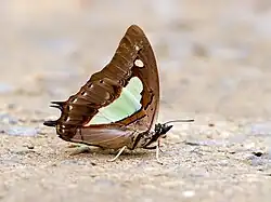 Polyura hebe has a wingspan of about 65 millimetres (2.6 in). In these medium-sized, heavy-bodies butterflies the outer edge of the forewings is concave, with a pointed apex and the hindwings show two short tails. The upperside of the wings is greenish white. A broad dark brown apical border, wide at the apex, but decreasing in width towards the base of the costa, forms a wide internal greenish-white band. Also the hindwings show a broad dark brown border, with submarginal small white marks. The underside is brown and has a wide pale silvery-green median patch. The caterpillar is bright green and has a black four-horned head.[2][3] Seitz - A species with many forms, inhabiting the whole of Macromalayana and parts of Micromalayana. hebe is especially beneath easily distinguishable from moori by the greenish median band being very much narrowed especially on the hindwings. The upper surface is characterized by the uniform black marginal zone of the hindwings, being never interrupted by yellow or greenish median marginal decorations as in moori.— [4] Seitz op. cit. gives an account of the numerous forms.