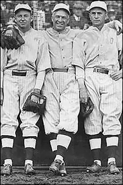 In his playing career, Portland manager Duffy Lewis was a member of the "Golden Outfield" of the Boston Red Sox of from 1910 through 1915. The outfield was considered one of the greatest outfields of all time.[46][47] Duffy played left field, along with center fielder Tris Speaker, and right fielder Harry Hooper. With the three in the outfield, Boston won the 1912 and 1915 World Series. Speaker and Hooper, are members of the Baseball Hall of Fame.[47][48][49] All three outfielders were noteworthy hitters and were also known for their exceptional fielding in the era.[50][51][52] Famed baseball writer Grantland Rice said in the era that the Golden Outfield was "the greatest defensive outfield I ever saw...They were smart and fast. They covered every square inch of the park – and they were like three fine infielders on ground balls. They could move into another country, if the ball happened to fall there."[46] Ty Cobb and former teammate Babe Ruth said that it was the best outfield that they had ever seen.[53]